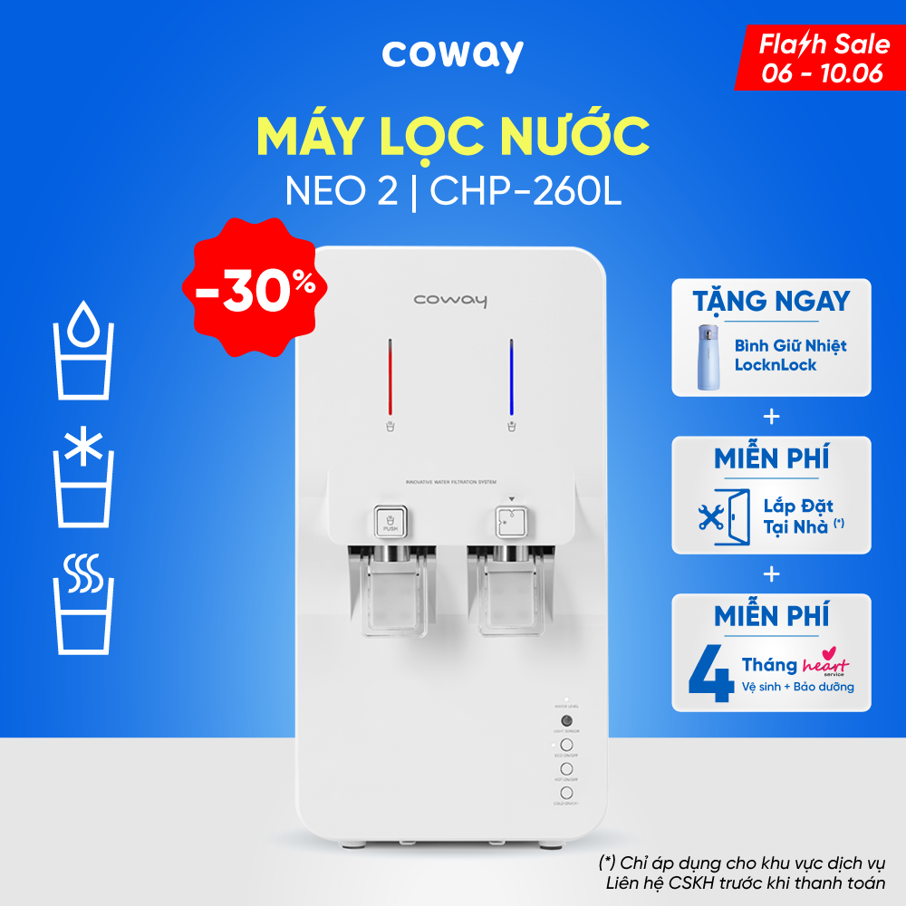 Chương trình Flash Sale của Coway từ ngày 06.06 đến 10.06.2024 là cơ hội tuyệt vời để bạn có thể sở hữu những sản phẩm chất lượng cao với mức giá ưu đãi. Đừng bỏ lỡ cơ hội này để cải thiện chất lượng không khí và nước uống cho gia đình bạn. Hãy nhanh tay đặt hàng các sản phẩm máy lọc không khí Aires 5, Cartridge white, Cartridge pink, Mighty và máy lọc nước Neo 2 để nhận ngay ưu đãi giảm giá 30%.