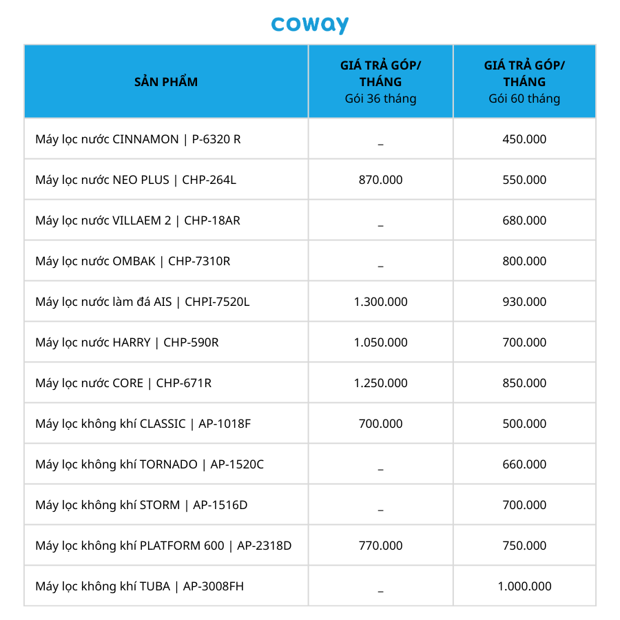 Bảng giá chi tiết các gói trả góp dành cho máy lọc Coway