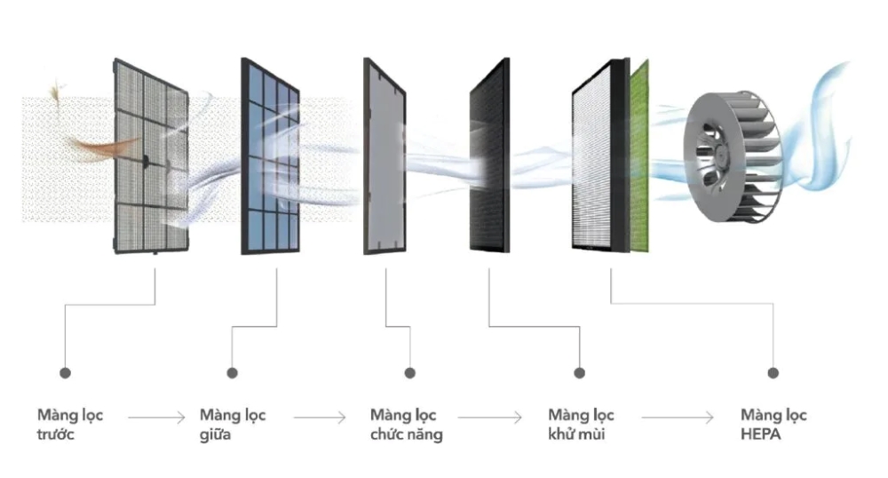 Màng lọc HEPA: Màng lọc HEPA có chức năng loại bỏ hiệu quả bụi mịn và khói thuốc lá. Trong khi các vi trùng và nấm mốc được loại bỏ bởi các vật liệu hữu cơ có chức năng kháng khuẩn và chống nấm mốc.