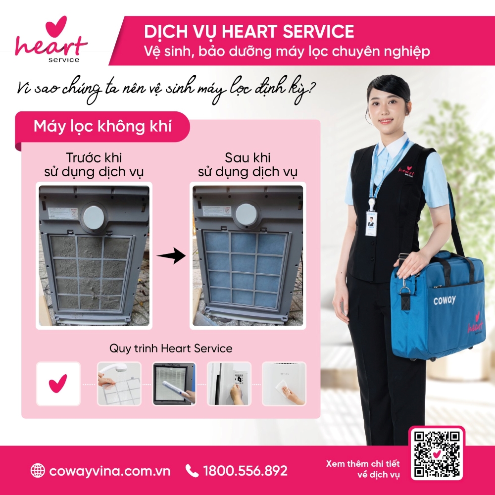 Nếu bạn đang sử dụng các sản phẩm máy lọc không khí Coway và quá bận rộn hoặc lo lắng về việc vệ sinh không đúng cách làm hỏng màng lọc đắt tiền, dịch vụ Heart Service độc quyền của Coway chính là lời giải hoàn hảo. Thay vì phải tự ghi nhớ lịch thay lõi hay loay hoay tìm dụng cụ vệ sinh, đội ngũ chuyên viên Cody (Coway Lady) sẽ thay bạn chăm sóc máy định kỳ 2-4 tháng/ lần với quy trình chuyên sâu: