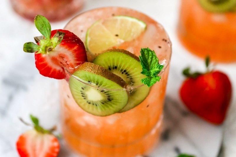 - Cách làm: Dâu tây cắt đôi hoặc thái lát, kiwi gọt vỏ thái lát tròn, chanh thái lát mỏng. Cho toàn bộ nguyên liệu vào bình cùng nước lọc, ngâm lạnh trong khoảng 3 tiếng.