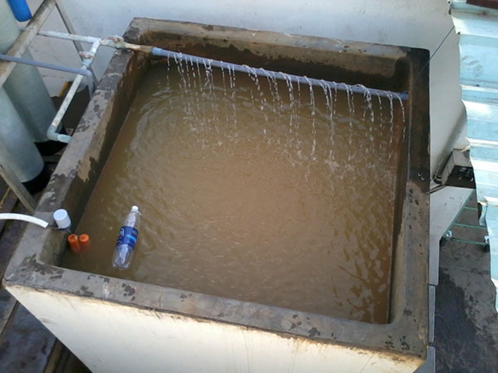 Khi bơm nước vào chậu và để lắng 30 phút sẽ thấy nước có cặn màu vàng đục và váng nổi dưới thành chậu.